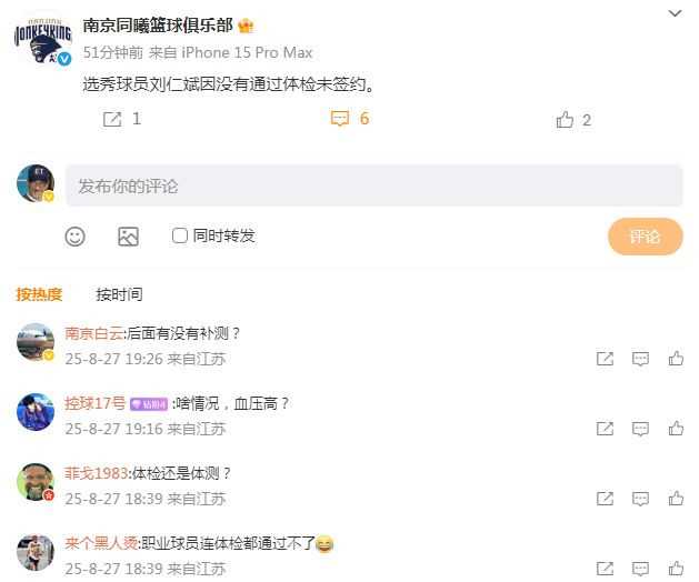 北京时间8月27日,南京同曦男篮官方宣布,26岁的新科选秀29号秀刘仁斌未能通过体检,因而未能与俱乐部签约,而他的体检具体问题并未对外公布。