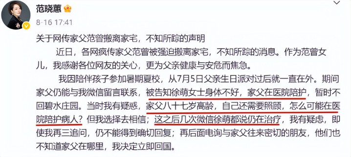 再联系范晓蕙说的徐萌生病,让87岁的老爷子去照料。
