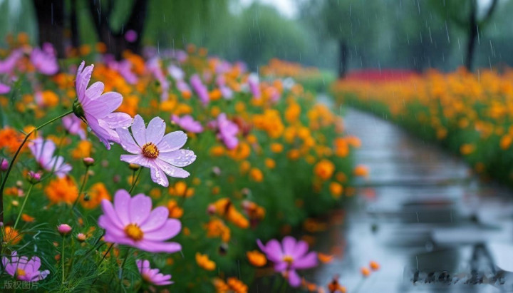 一路前行,花开不断。有紫茉莉,一大丛的紫色或黄争的花朵,静静地开放着。淡淡的清香,伴着风的温柔,在空气中弥漫着。有黄秋英,一朵朵在细长的花茎上摇曳着风情。还有翠菊,粉紫色的花朵,饱满芬芳。更让你惊喜的是发现一片常春花。绿叶葱茏,花朵浓密,色泽鲜美,如油画一般地铺展在地面上。你站在那里痴痴地看着,这份清秋中让人惊艳的色彩。花叶沾水,娇嫩欲滴。粉紫色的花朵,如一把把撑开的小伞,十分可爱。你忍不住用手机记录一下这份花开的美丽的风景。