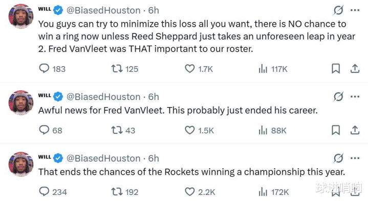休城媒体BiasedHousto连续发文点评,难掩悲伤与失落之情,坦言新赛季火箭队可能已经无力争冠。