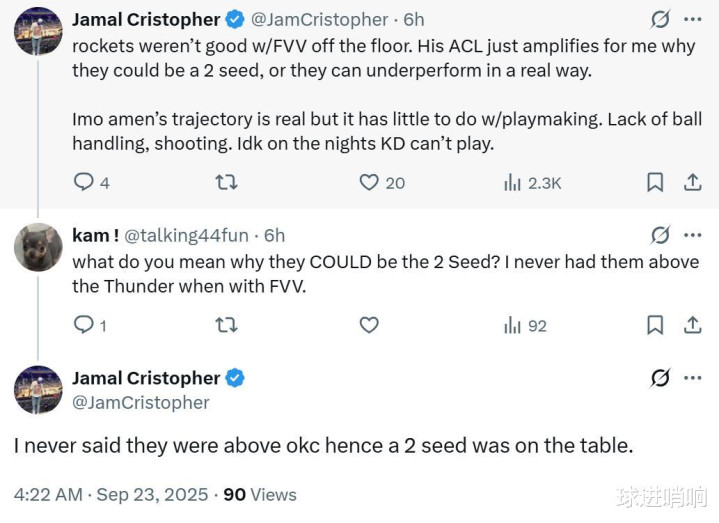 面对火箭队遭遇如此打击,快船队记者Jamal Cristopher连续发文点评,认为范乔丹受伤将导致火箭队陷入结构性问题,新赛季将一败涂地,况且他们原本就不如雷霆、掘金与湖人。