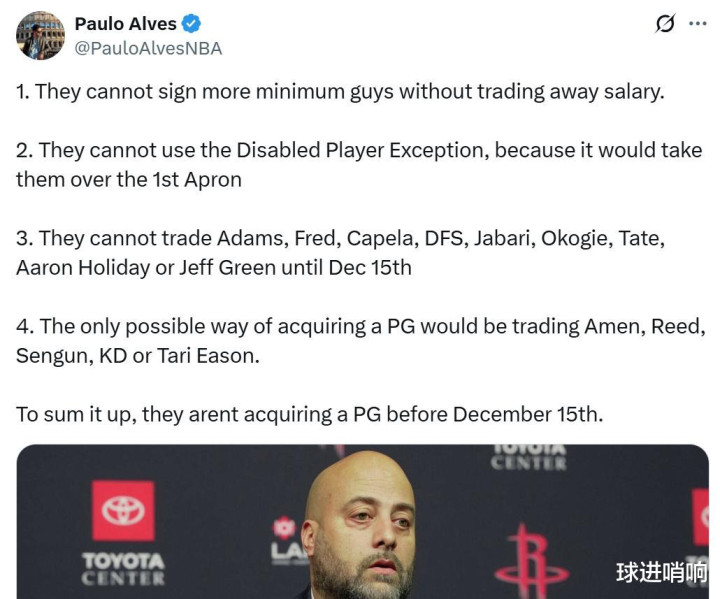 这意味着,火箭队在折损首发控卫的情况下,还难以将其交易出队进行补强,同时火箭队触发硬帽,无法使用伤病特例签人,剩余薪金空间仅剩120万美元也无法使用底薪签第15人。