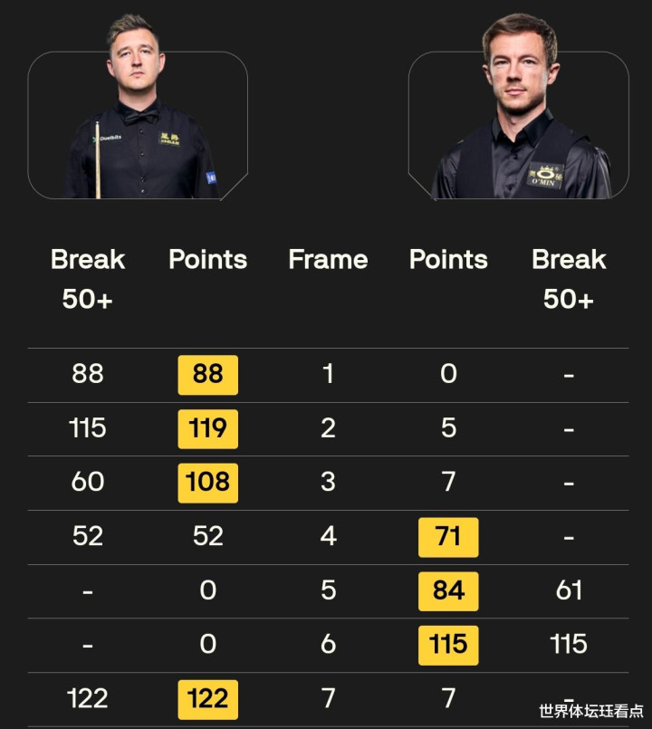 世界排名第二的凯伦威尔逊则是单杆打出88分、115分、60分、52分和122分的表现连胜三局以4-3惊险绝杀利索夫斯基晋级八强。