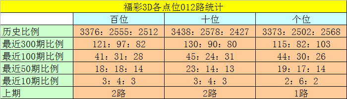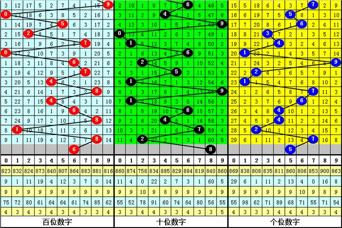 百位分析:该位最近10期开出了3个0路号码、4个1路号码、3个2路号码,1路号码热出。本期排除2路号码,参考号码:6。