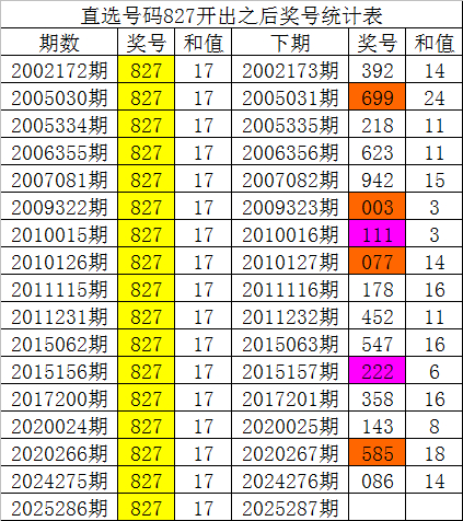 福彩3D第2025286期开出直选号码为:827,该直选号码历史上出现了17次,其下期分别开出了号码:392、699、218、623、942、003、111、077、178、452、547、222、358、143、585、086,如图: