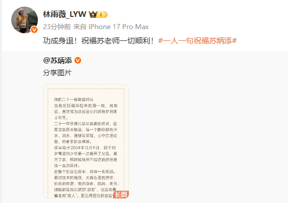 运动员@林雨薇_LYW发文祝福苏炳添:“功成身退!祝福苏老师一切顺利!”