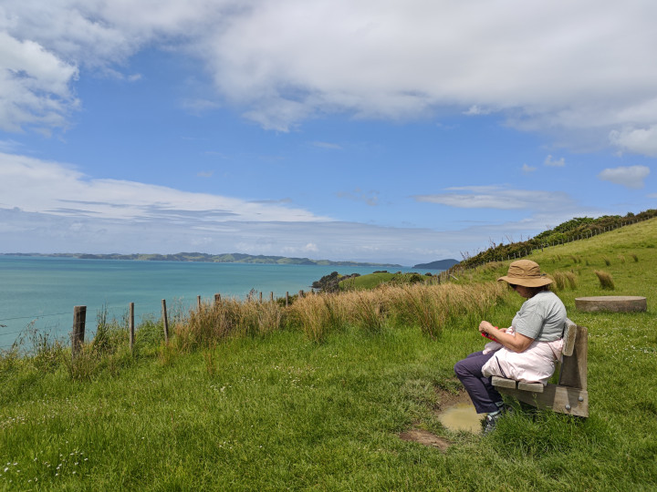 穿越又一个牧场,来到海湾的另一头,这里面对大海的山坡上也有一条连椅,老婆走过去坐了下来,她也想好好享受一下这里自然界的美啊……