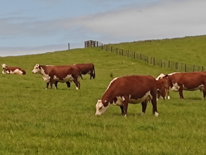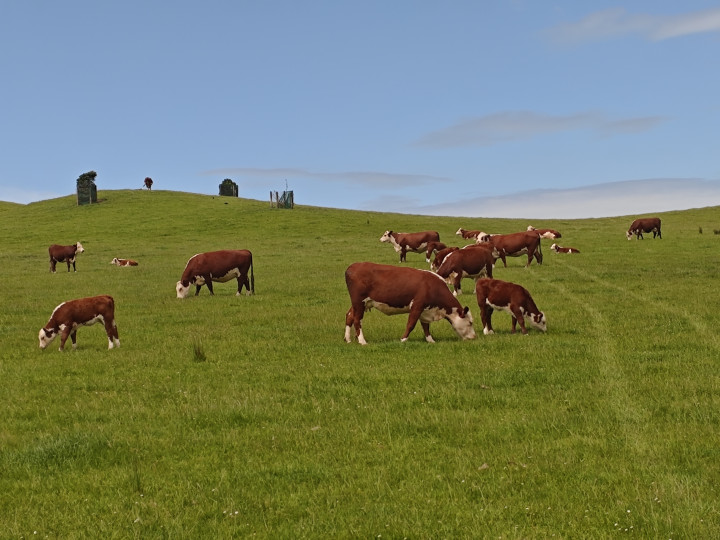 走上一个小山坡,就进入一个牧牛的草场区,牛群在悠闲自在地吃草,进入牛栏的提示牌上告诉游客远离公牛……