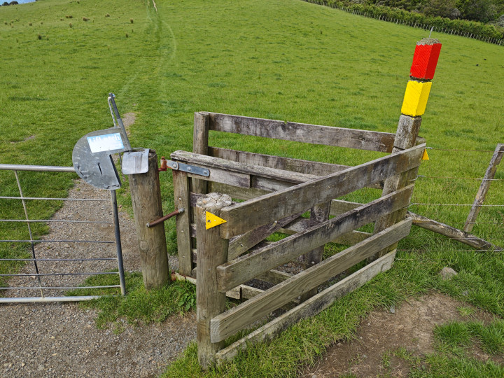 绕过这个海湾,就是我们要徒步的牧场,停好车,看着牧场上的徒步指示牌,上面介绍了三种路线,分别用红蓝黄三种颜色来区别,女儿担心妈妈的膝盖,就为我们现在了比较短的红色线路……